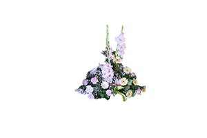 Artnr: . Stående sorgdekoration i vitt, rosa och lila.